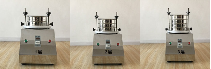 二、把标准筛具按孔径从大到小,从下到上依次叠放到托盘座上,由凹槽或定位螺丝对标准筛具进行定位。